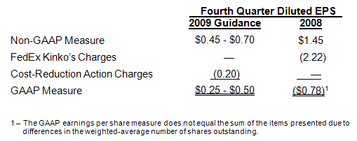 The company believes that meaningful analysis of our financial performance requires an understanding of the factors underlying that performance and our judgments about the likelihood that particular factors will repeat. Excluding the estimated impact of charges related to cost-reduction actions from our earnings guidance for the fourth quarter of fiscal 2009 will allow more accurate comparisons to our operating performance during the fourth quarter of fiscal 2008. Likewise, excluding the impact of the FedEx Kinko's-related charges from fiscal 2008 fourth quarter results will allow more accurate comparisons to our earnings guidance for the fourth quarter of fiscal 2009. The table below presents a reconciliation of our presented non-GAAP measures to the most directly comparable GAAP measures.