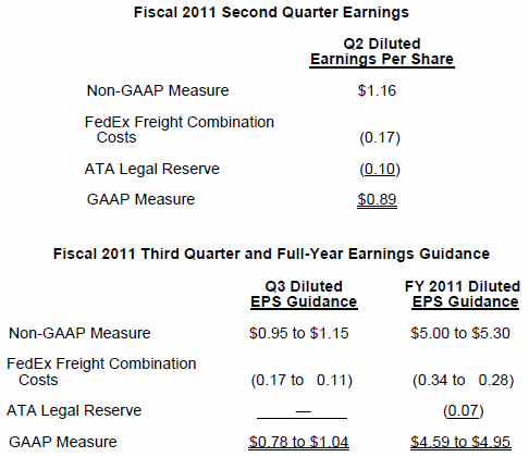 The company believes that meaningful analysis of our financial performance requires an understanding of the factors underlying that performance and our judgments about the likelihood that particular factors will repeat. Excluding a reserve associated with a legal matter and the costs of the combination of FedEx Freight and FedEx National LTL operations from our second quarter earnings and our earnings guidance, net of applicable incentive compensation impacts, will allow more accurate comparisons to prior periods of our second quarter operating performance and our expected operating performance in fiscal 2011. As required by SEC rules, the tables below present a reconciliation of our presented non-GAAP measures to the most directly comparable GAAP measures.